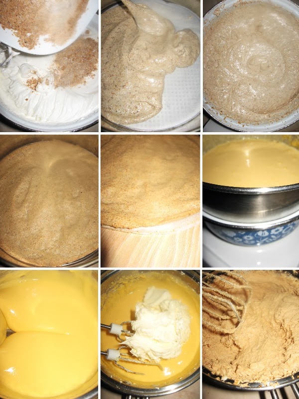 BISKVIT - spojiti sve suve sastojke (orahe, keks, vanil šećer, prašak za pecivo, cimet). Uključite rernu na 170 stepeni (bez fena). Mikserom umutiti puter i šećer, pa dodati žumanca i mutiti dok se ne poveže sve (sliku sa jajima sam zaboravila da dodam, da vas ne buni). Dodati suve sastojke, pa nastaviti sa mućenjem, a onda sipati 180g otopljene čokolade i mutiti dok masa nije jednolične boje. Belanca umutiti sa prstohvatom soli u čvrst šam, pa onda dodavati šam u fil, onako tri po tri kašike, tj. dodate malo, pa nastavite sa mućenjem na najmanjoj brzini samo da se ujednači i to uvek u istom smeru, i tako dok ne potrošite šam.